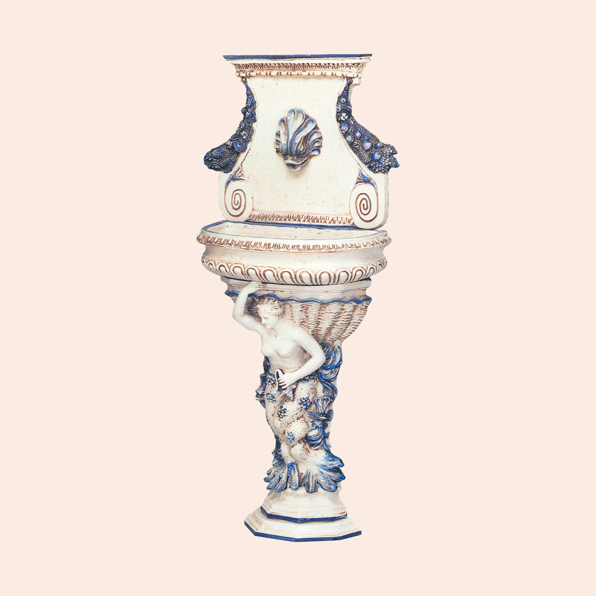ELEGANT WALL FOUNTAIN WITH MERMAID, FISH AND SHELLS, BEAUTIFULLY HAND-PAINTED IN TUSCANY, A UNIQUE PIECE OF ELABORATE CRAFTSMANSHIP. IT MEASURES CM.153X70X34