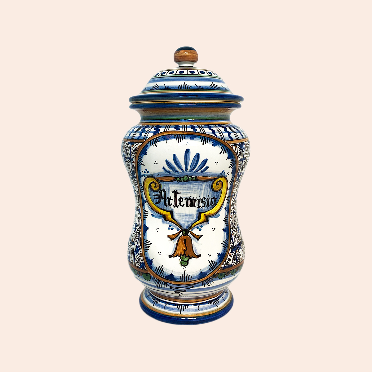 PHARMACY POT, HAND-MADE AND HAND-PAINTED IN OUR CERAMIC STUDIO IN TUSCANY. THESE POTS HAVE THE NAMES OF THE SEVERAL OINTMENTS WHICH THEY CONTAINED IN THE MIDDLE AGES, MADE MAINLY WITH MEDICINAL HERBS, ANIMAL OR VEGETAL FATS.