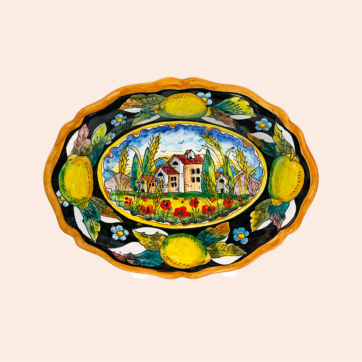 SMALL OVAL SCALLOPED EDGED TRAY TO SERVE VEGETABLE OR OTHER TYPES OF FOOD. HAND-MADE AND HAND-PAINTED IN TUSCANY, IT MEASURES CM.25LX19WX5H.