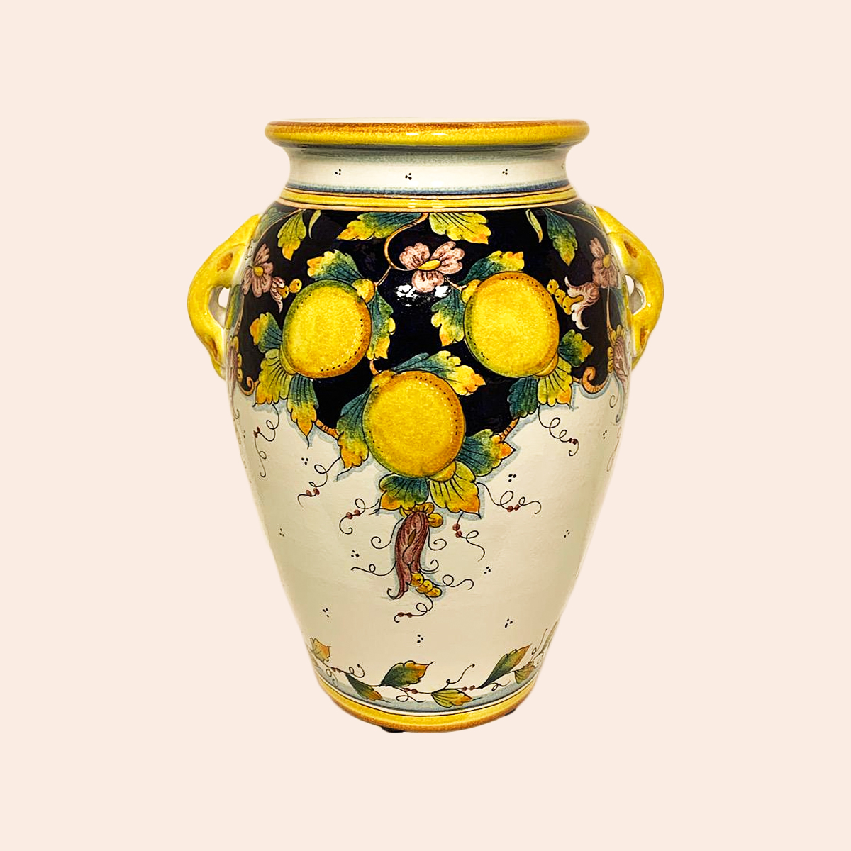 Vase with lemons on blue and pink flowers cm.50hx40w(from handle to handle)