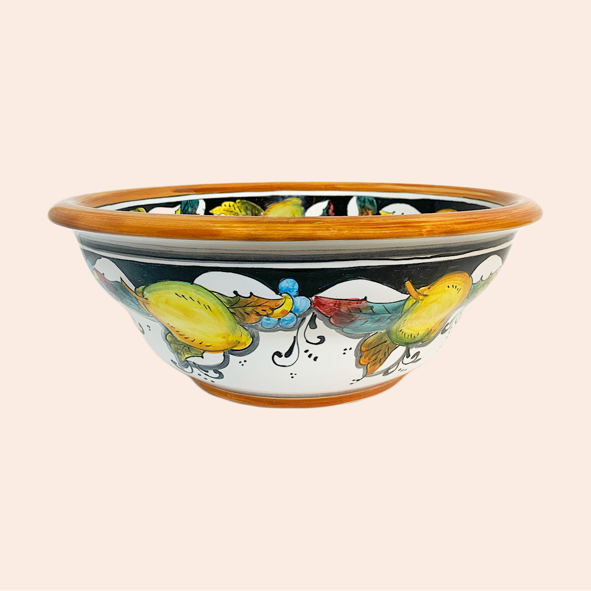 CIOTOLA PER PASTA, ZUPPE O INSALATE MA NELLA FORMA DEI VECCHI CATINI LAVAMANI CHE UNA VOLTA VENIVANO USATI PER LAVARSI. FATTA E DIPINTA A MANO NEL NOSTRO LABORATORIO DI CERAMICHE IN TOSCANA. MISURA CM.33DX12H.