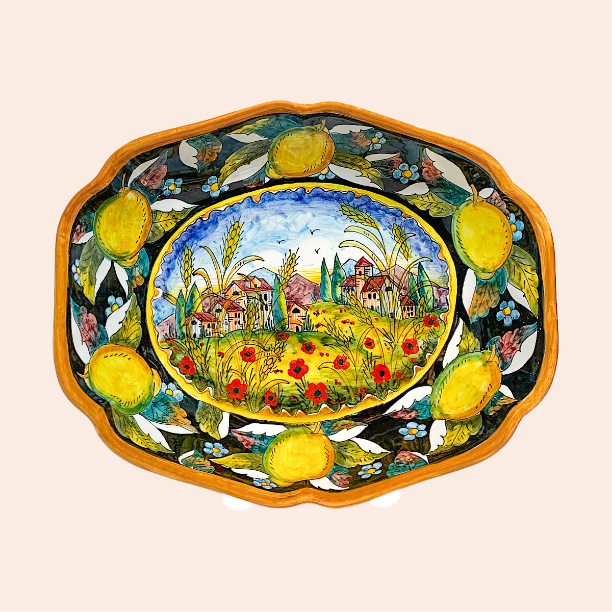 CIOTOLA E INSALATIERA OVALE CON BORDO SMERLATO FATTA E DIPINTA A MANO NEL NOSTRO LABORATORIO DI CERAMICHE IN TOSCANA. MISURA CM.36X29X9H.