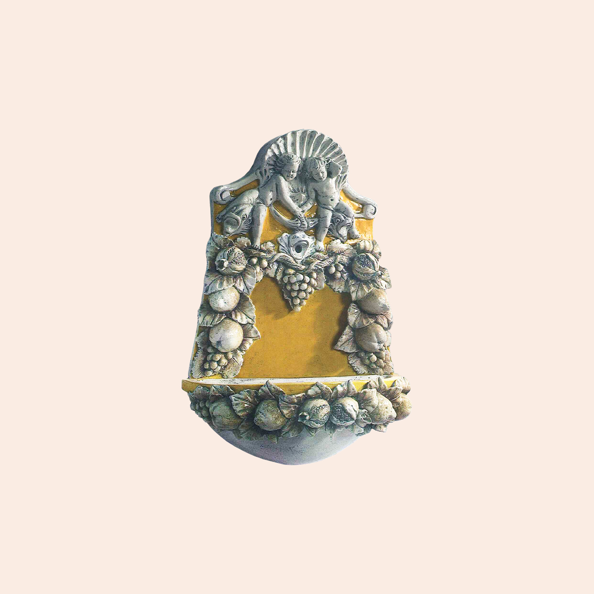 FONTANA A MURO CON MASCHERONI, FATTA E DIPINTA A MANO IN TOSCANA. ADATTA SIA AD USO ESTERNO CHE INTERNO E' COMPOSTA DA UN UNICO PEZZO CHE MISURA CM.90X60
